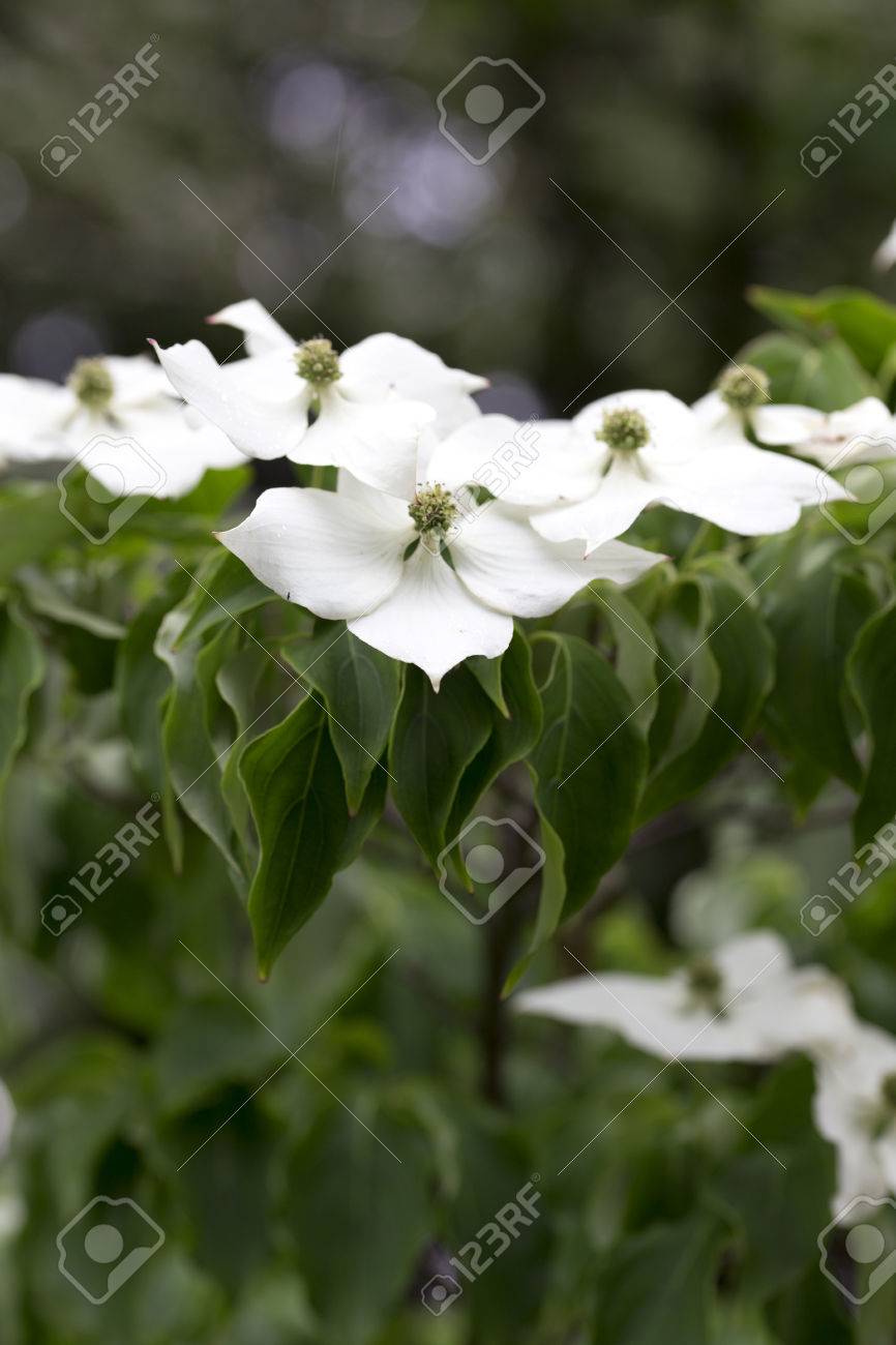 Flowering Kousa Dogwood Tree Blooming In A Formal Garden